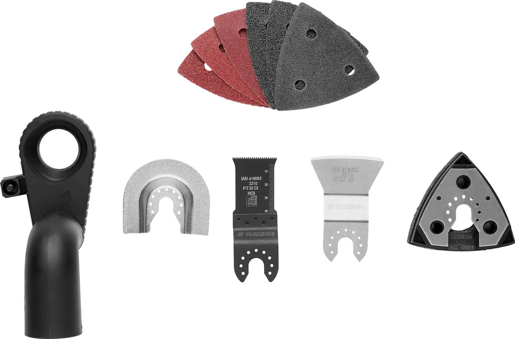 Συμπεριλαμβανόμενα αξεσουάρ: 1x πριονόλαμα βυθιζόμενου κοπτικού HCS, 1x πριονόλαμα διαμαντιού, 1x ξύστρα, 1x πλάκα λείανσης δέλτα, 1x προσαρμογέας για εξωτερική αναρρόφηση σκόνης, 6x φύλλα λείανσης (3x ξύλο - κόκκωση 60 / 80 / 120, 3x μέταλλο - κόκκωση 60 / 80 / 120)
