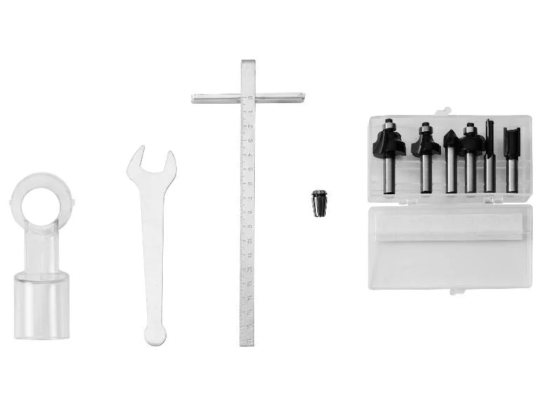 🔹️Αξεσουάρ: Σετ 6 τεμαχίων με μύτες φρέζας για ξύλο (1 κόφτης προφίλ, 1 κόφτης στρογγυλής κοπής, 1 κόφτης αυλακιού V, 2 κόφτες αυλακώσεων, 1 κόφτης κοιλότητας), 1 παράλληλο στοπ, 1 δακτύλιος, 1 ανοιχτό κλειδί, 1 προσαρμογέας για εξωτερική αναρρόφηση σκόνης, Υλικό: Πλαστικό, χυτό αλουμίνιο, Κόφτης: Χάλυβας, Διαστάσεις: Συσκευή χωρίς μπαταρία: περίπου. 160 x 85 x 220 mm